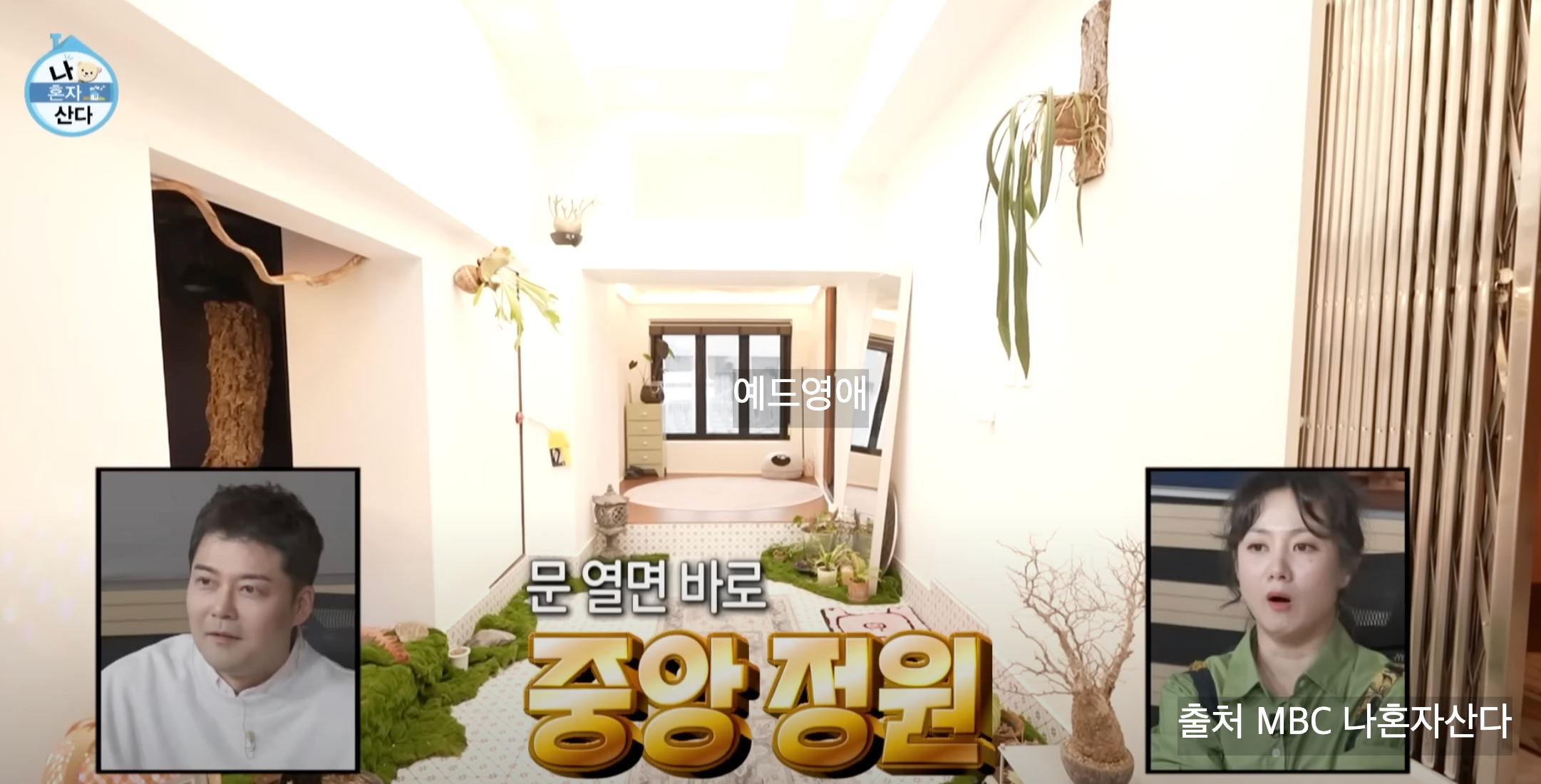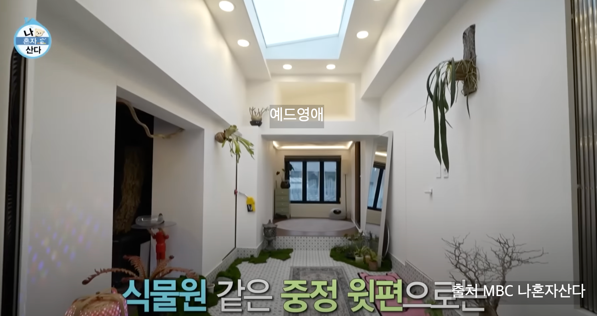 문을 열면 펼쳐지는 중앙 정원은 푸른 식물과 인조 이끼로 채워져 있어 자연을 가까이 느낄 수 있게 해줍니다. 마치 작은 식물원을 연상시키는 이 공간은 그의 새로운 집의 하이라이트 중 하나입니다.