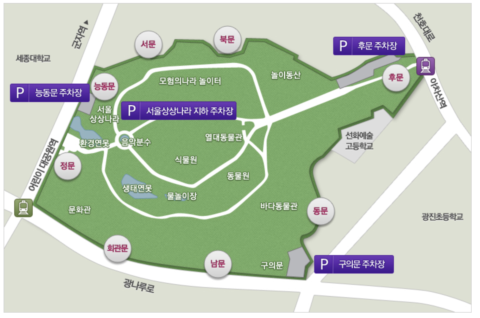 어린이 대공원 주차장은 (정문, 서울상상나라 지하주차장, 후문, 구의문) 주차장이 협소하여 대중교통 이용을 추천드립니다.