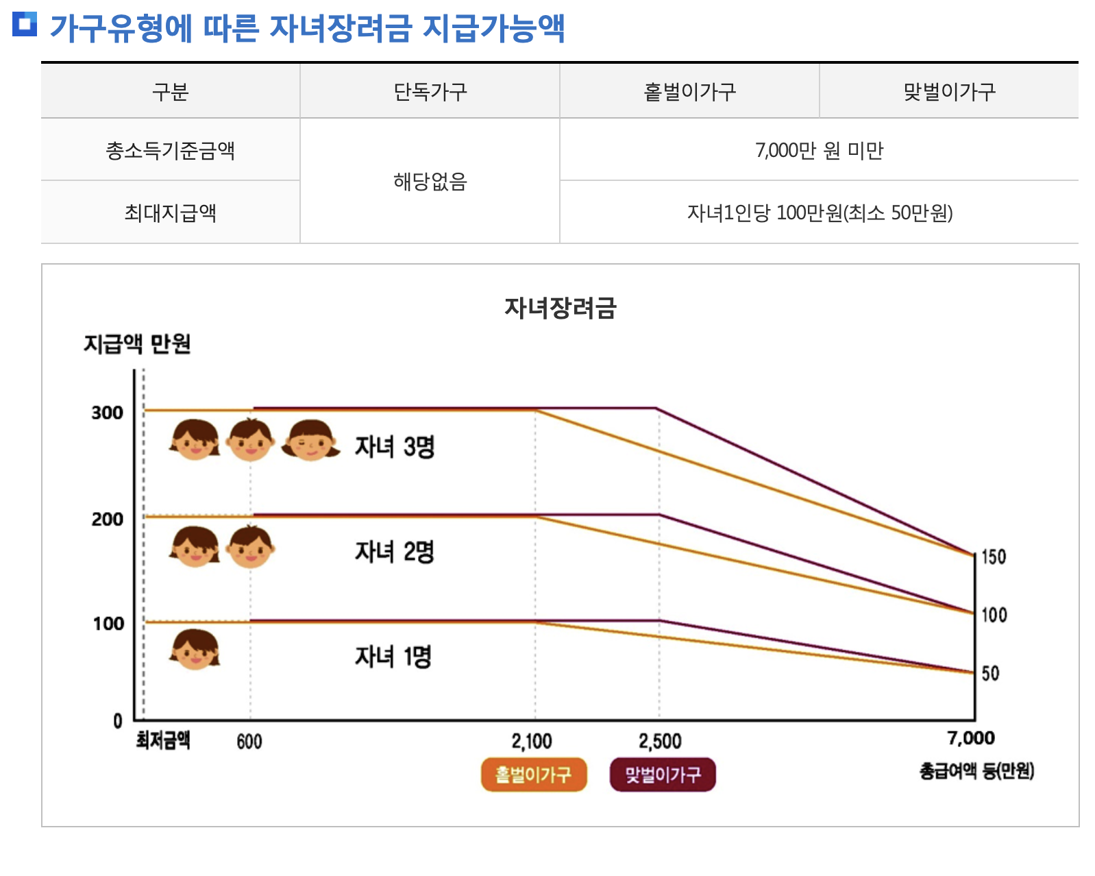 - 홑벌이가구: 자녀 1인당 최대 1,000,000원